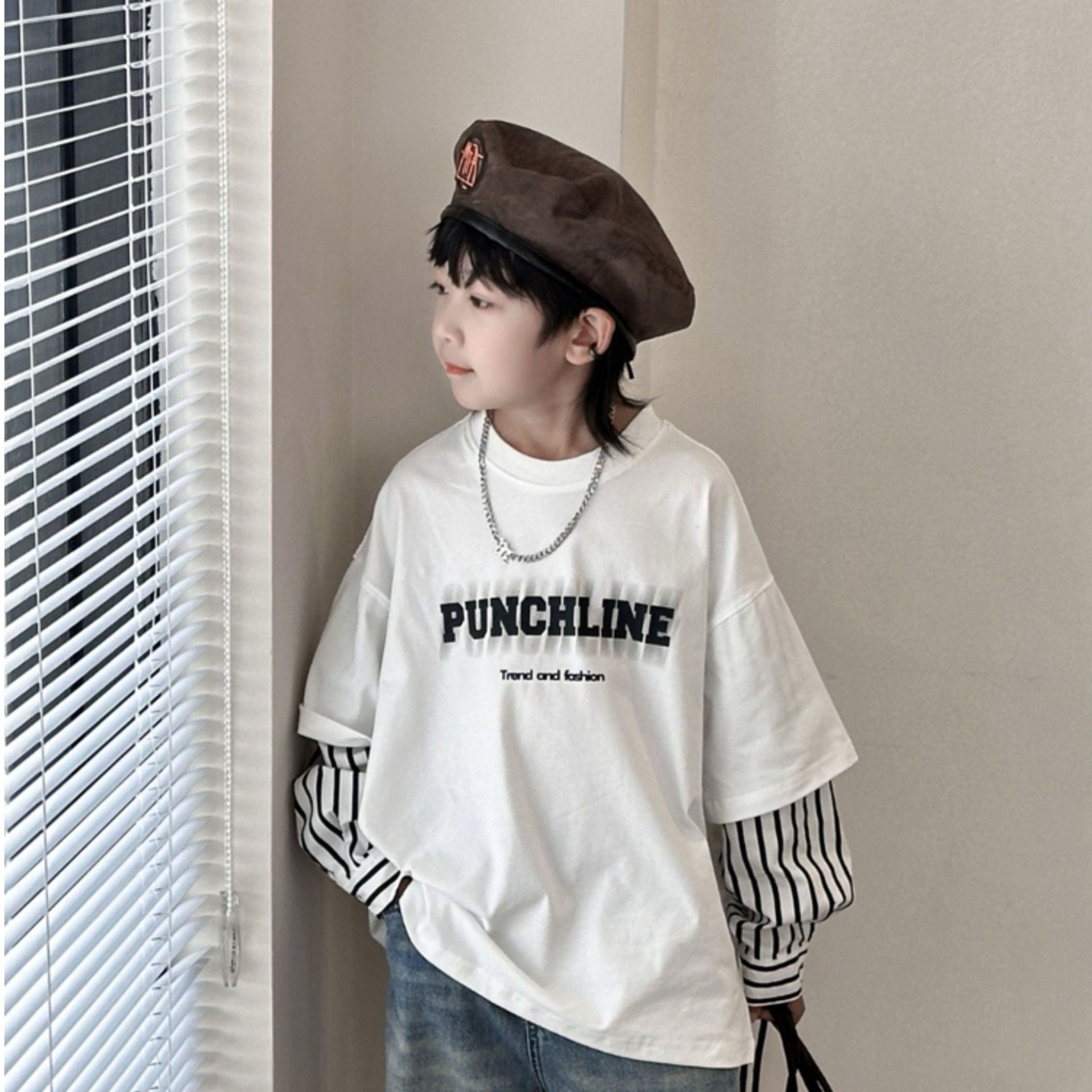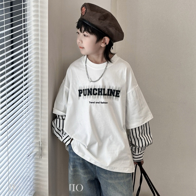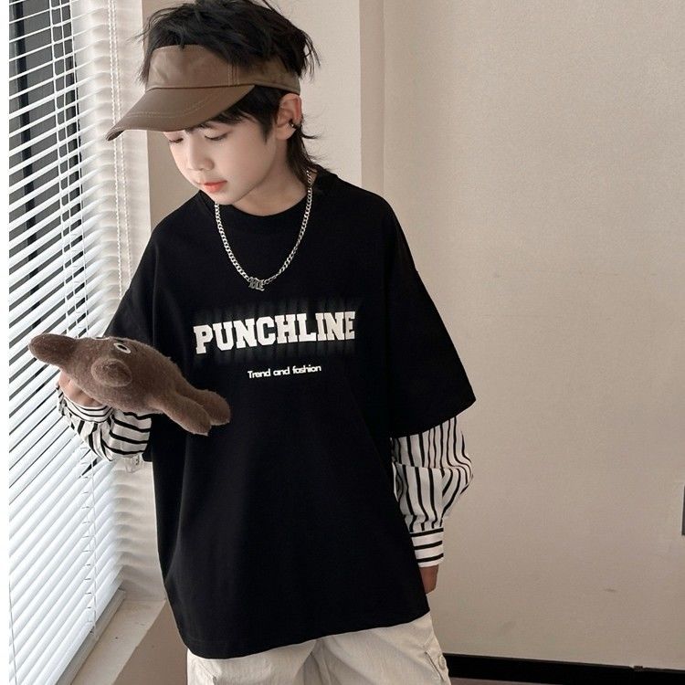 男潮流韩版童装2024春儿童潮酷拼接假两件卫衣中大童套头长袖T恤