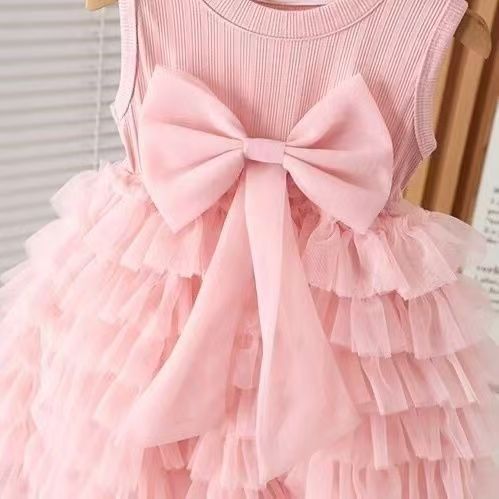 儿童网纱公主蛋糕裙女童无袖蝴蝶结连衣裙洋气甜美木耳边蓬蓬长裙
