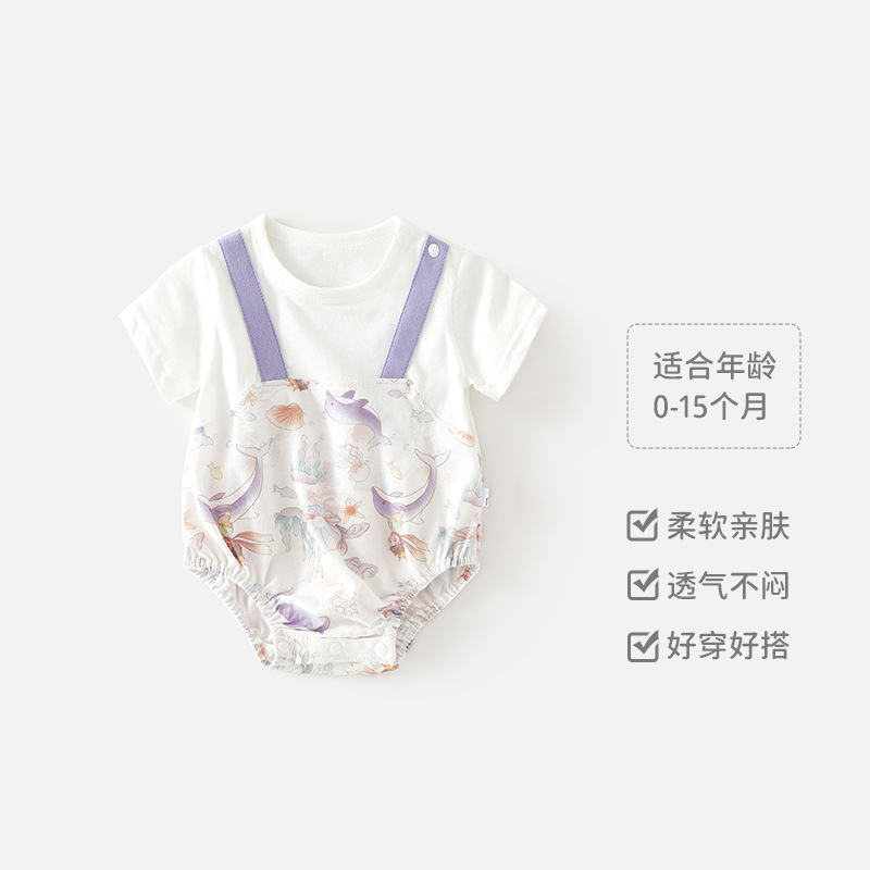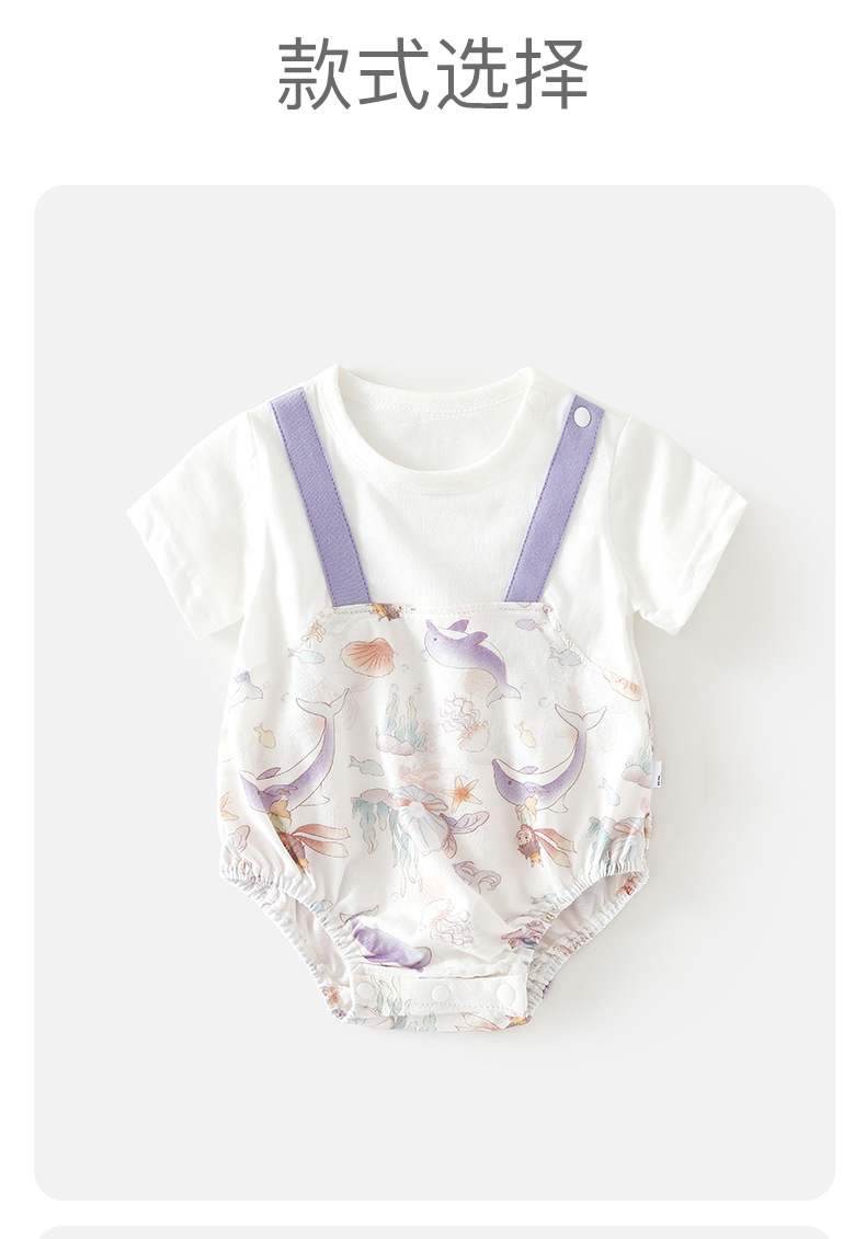 婴儿夏季纯棉短袖包屁衣新生儿假两件背带三角哈衣宝宝可爱连体衣
