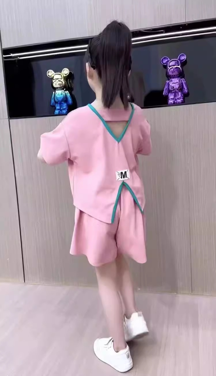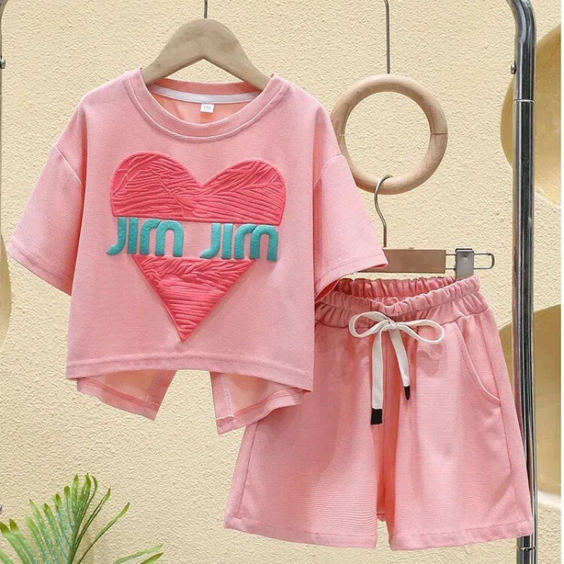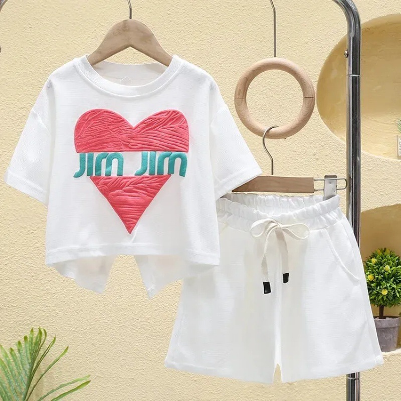 女童华夫格短袖套装新款儿童夏季卡通休闲夏装短裤宝宝休闲套装