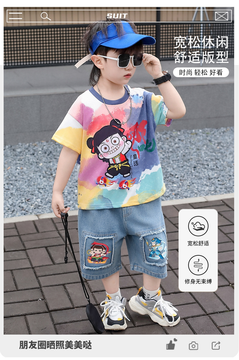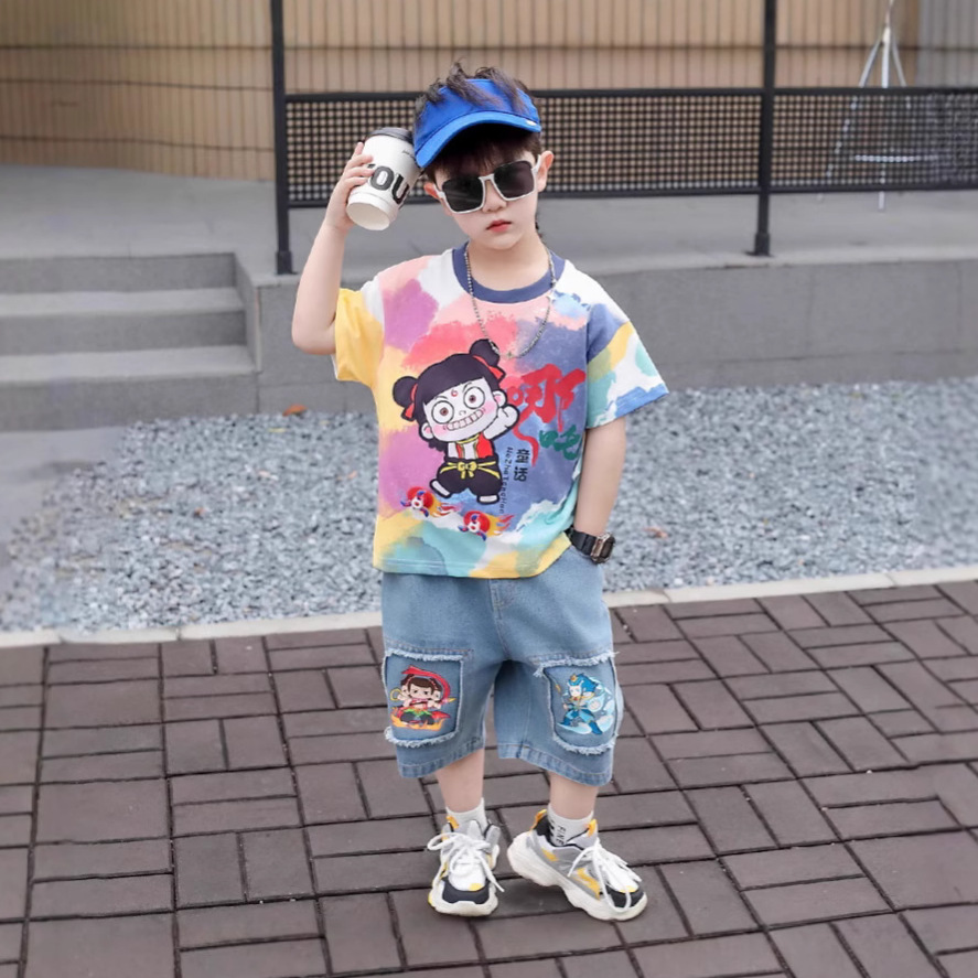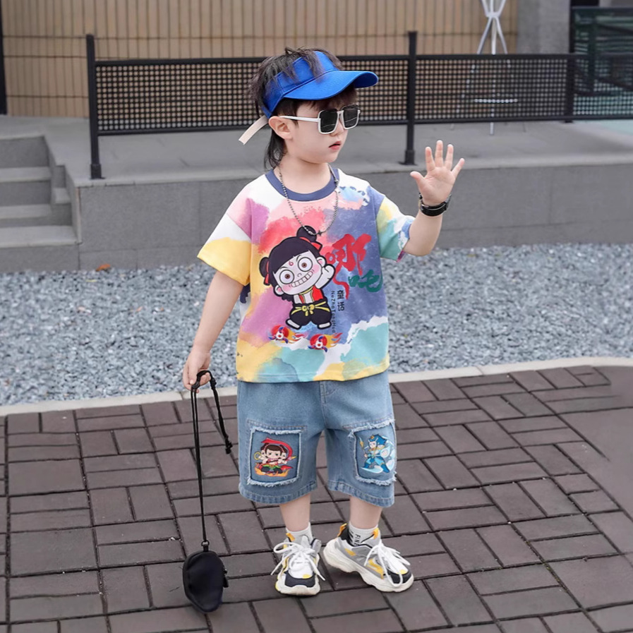 哪吒衣服男童夏装套装2025新款儿童装潮酷时髦夏季短袖扎染两件套