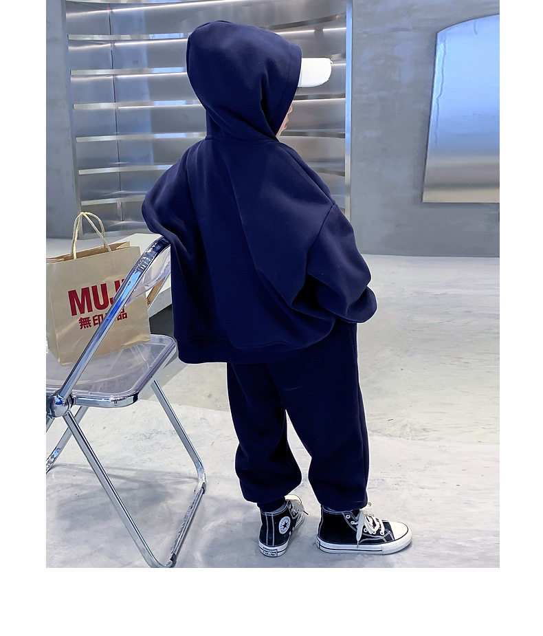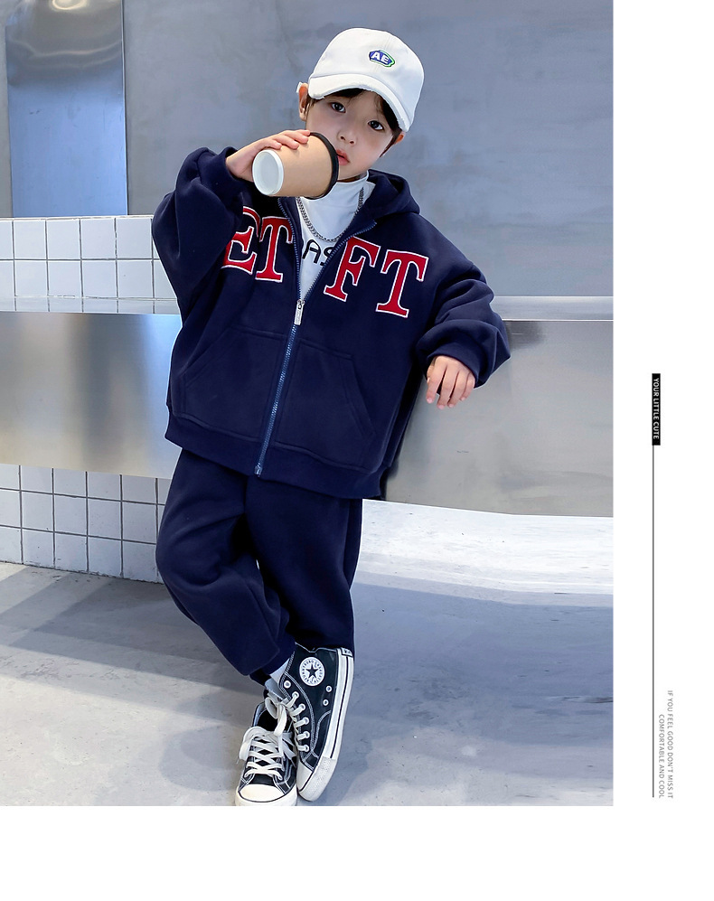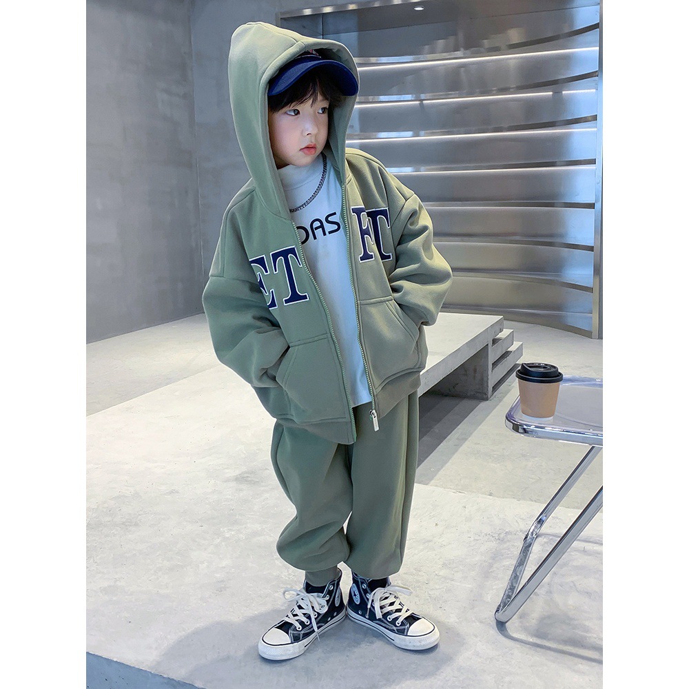 男童春季加绒卫衣套装2025新款中大童男孩连帽运动洋气秋冬装潮