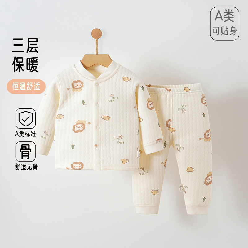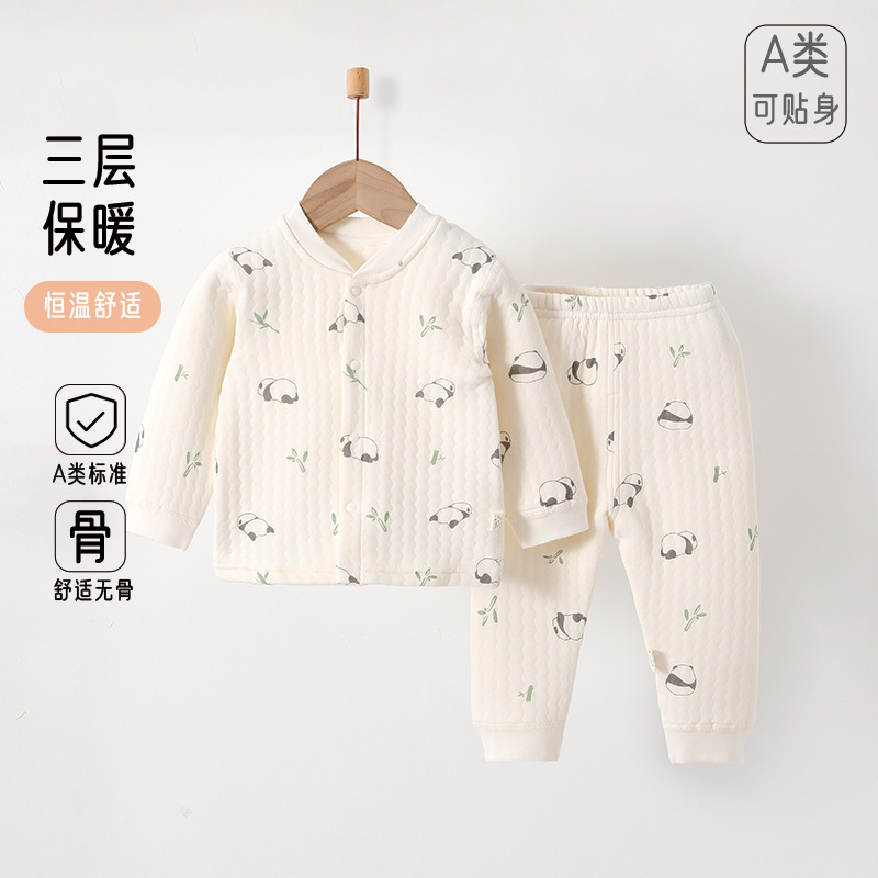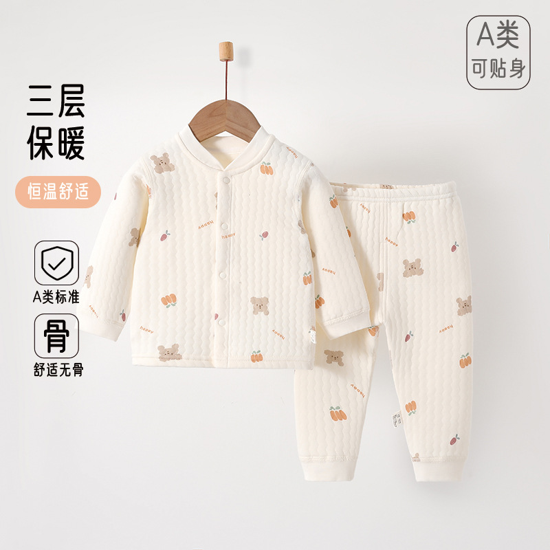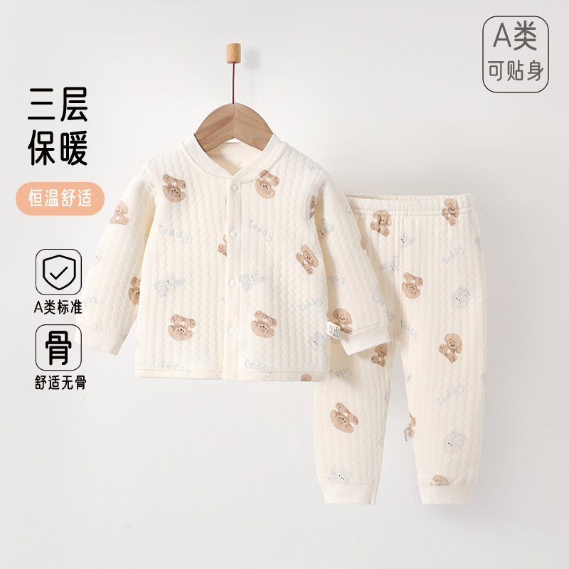 婴幼儿秋冬款纯棉无骨夹棉三层保暖加厚男女宝宝分体套装家居衣服