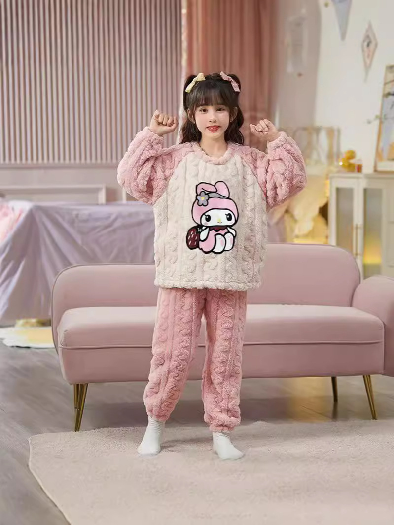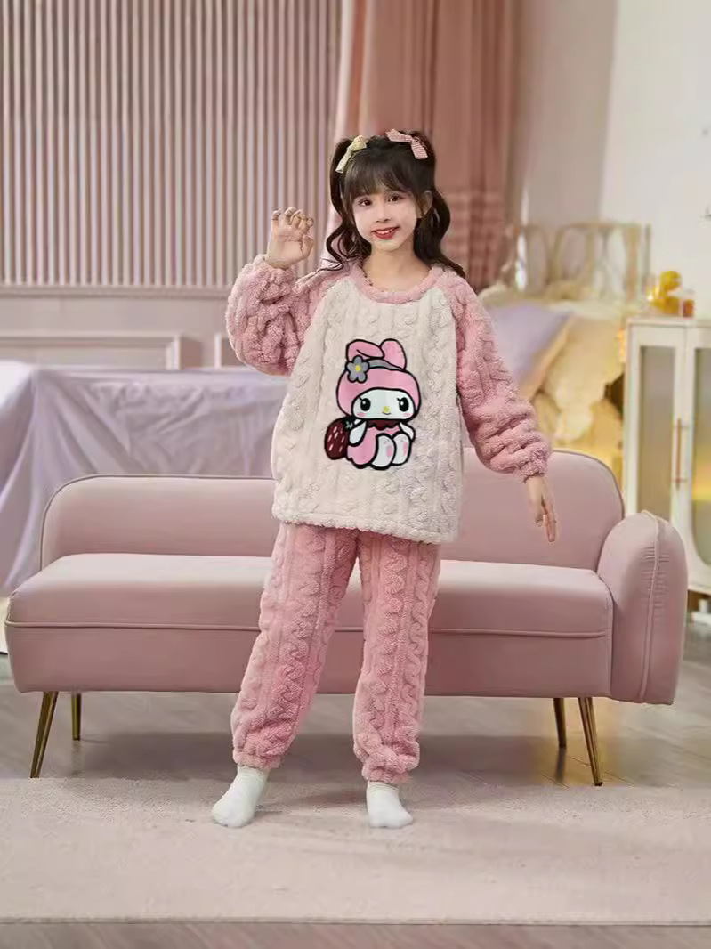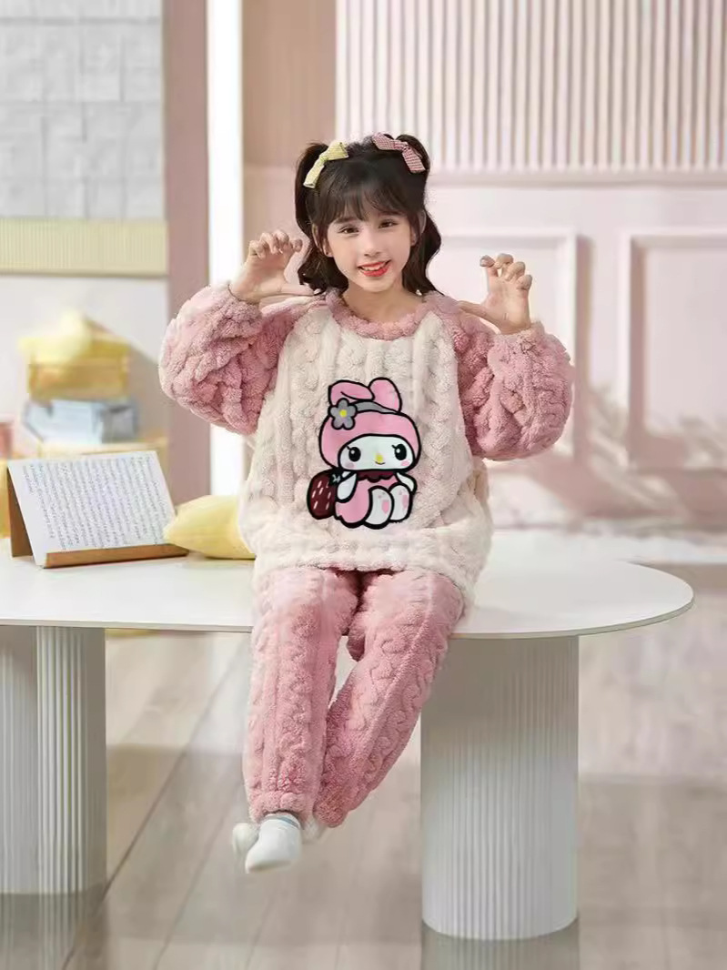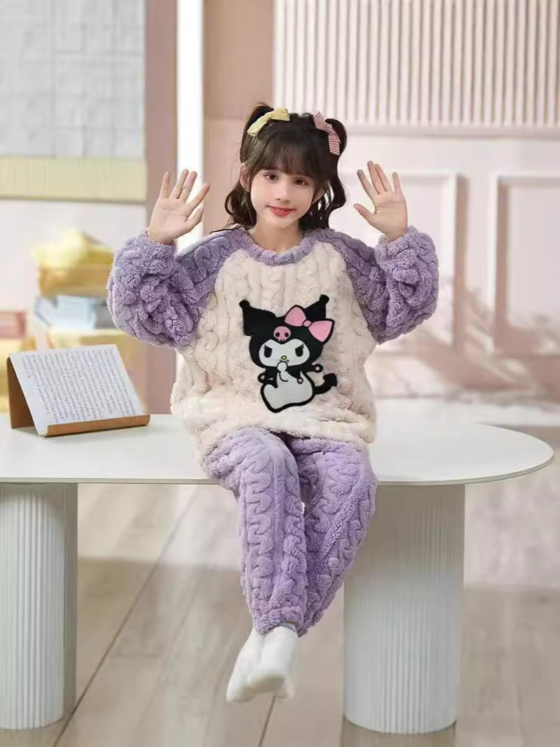 秋冬法兰绒女宝宝洋气法兰绒女孩可爱家居服套装库洛米睡衣珊瑚绒