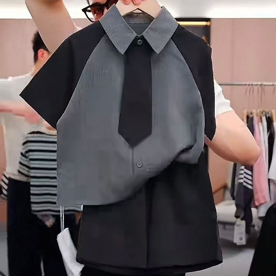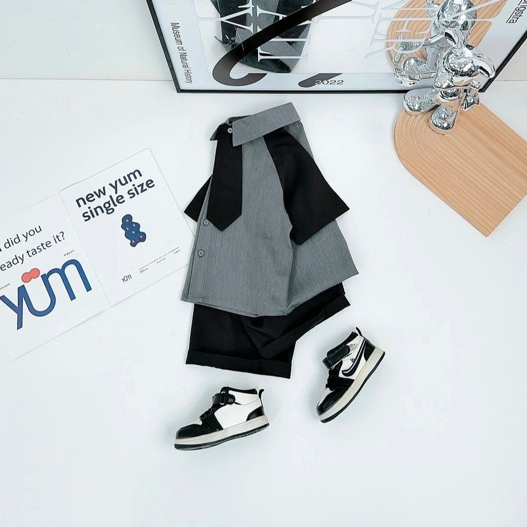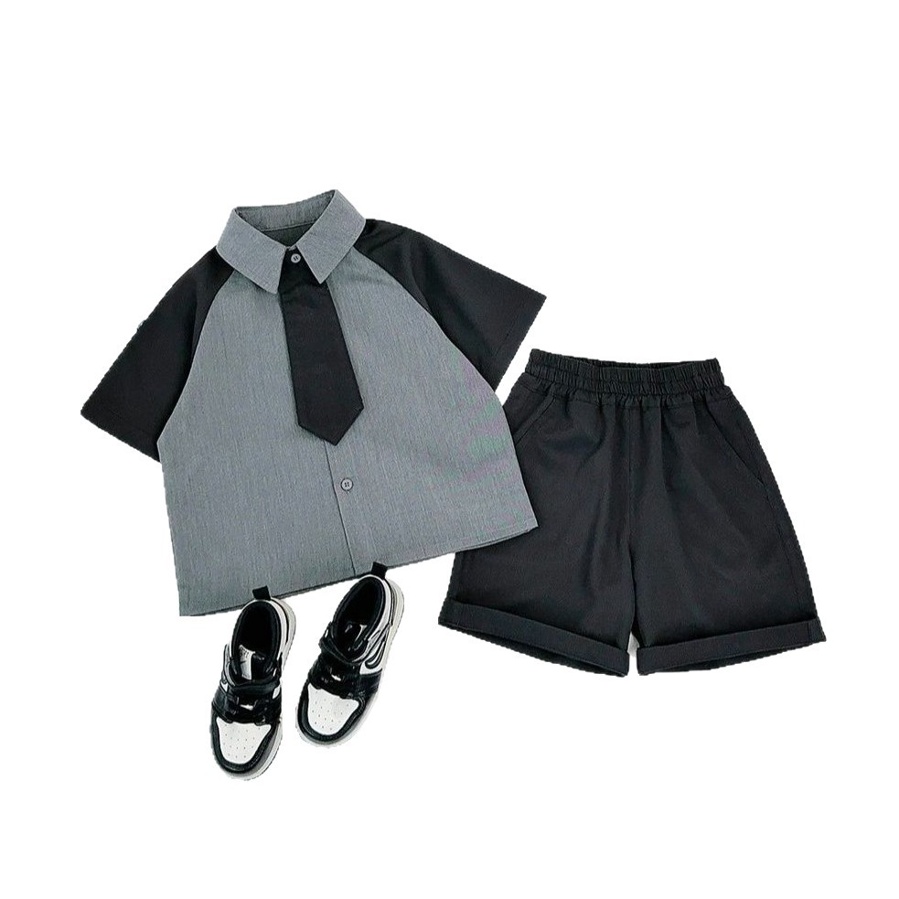 男童套装2025夏季韩版衬衫套装夏季短袖薄款领带衬衣短西裤两件套