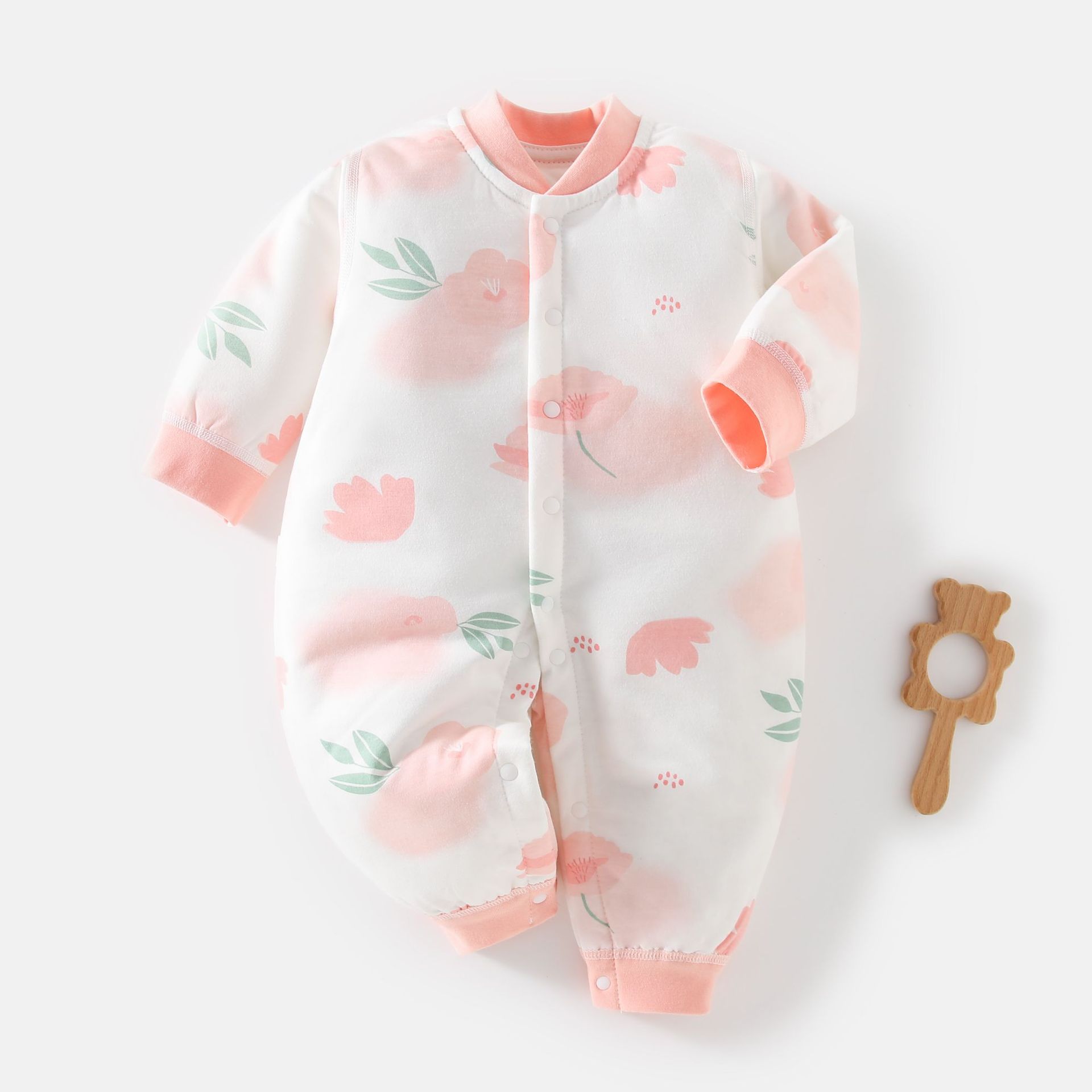 初生婴儿连体衣春秋纯棉宝宝哈衣和尚服三层保暖偏襟细带可爱翻领